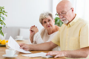 Elderly couple calculating costs of household. Senior people with low pension